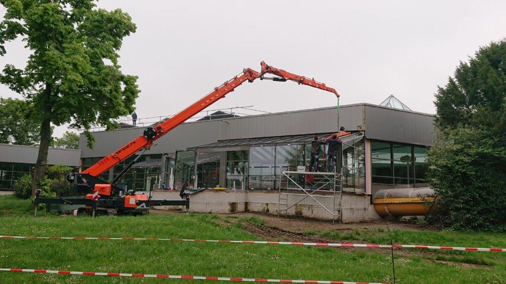 Mit unserem Minikran können die Arbeiten emissionsfrei durch zusätzlichen Elektroantrieb durchgeführt werden.